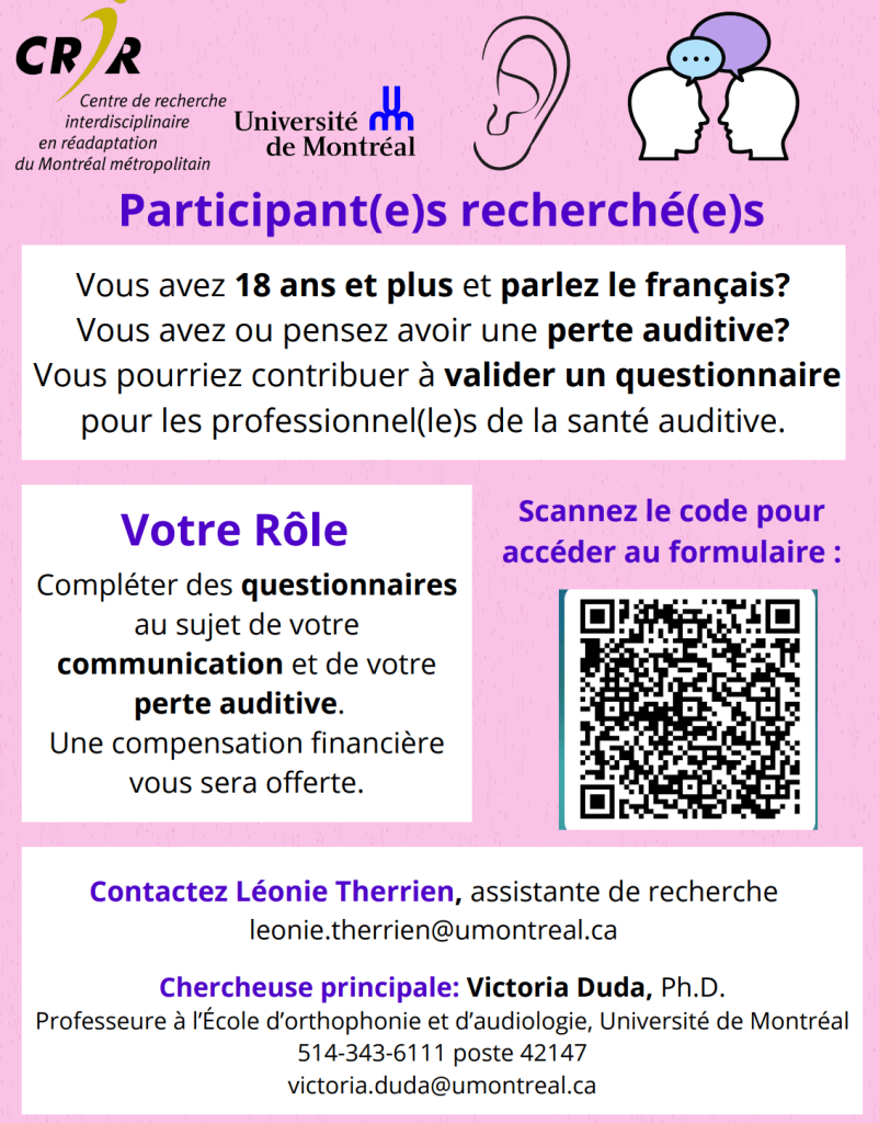 Retrouvez notre affiche sur notre programme de formation pour les utilisateurs d’aides auditives au 5e Congrès québécois de recherche en adaptation-réadaptation Détails sur l’intervention : Références Backenroth, G. A., & Ahlner, B. O. (2000). Quality of life of hearing-impaired persons who have participated in audiological rehabilitation counselling. International Journal for the Advancement of Counselling, 22(3),